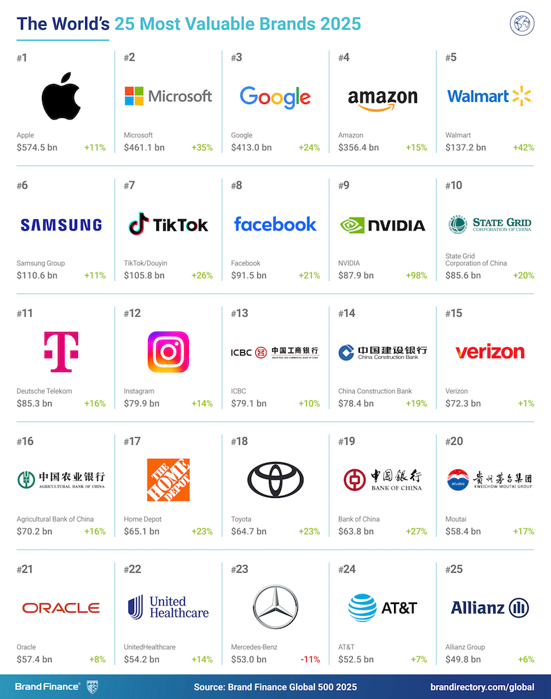 It shows the estimated brand value for the 25 most valuable brands in the world and also looks at how much each brand's value has increased year over year.