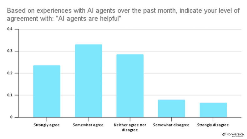 Some 57% respondents either strongly or somewhat agree that AI agents have been helpful during their customer experience interactions.