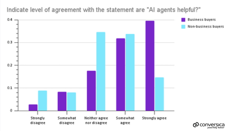 Business buyers are significantly more likely than nonbusiness buyers to strongly agree that AI agents are helpful.
