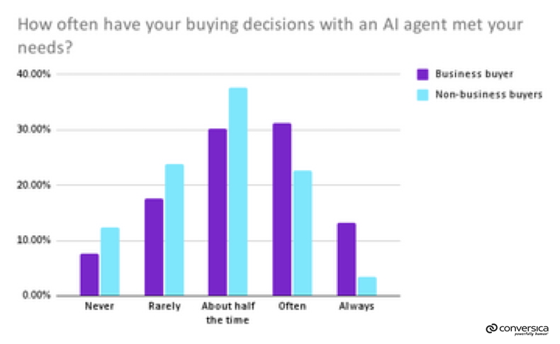 Business buyers are more likely than nonbusiness buyers to say AI customer service agents often or always meet their needs.