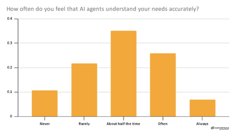 Some 35% of respondents say AI agents understand their needs accurately about half the time, and 33% say AI agents often or always understand their needs.