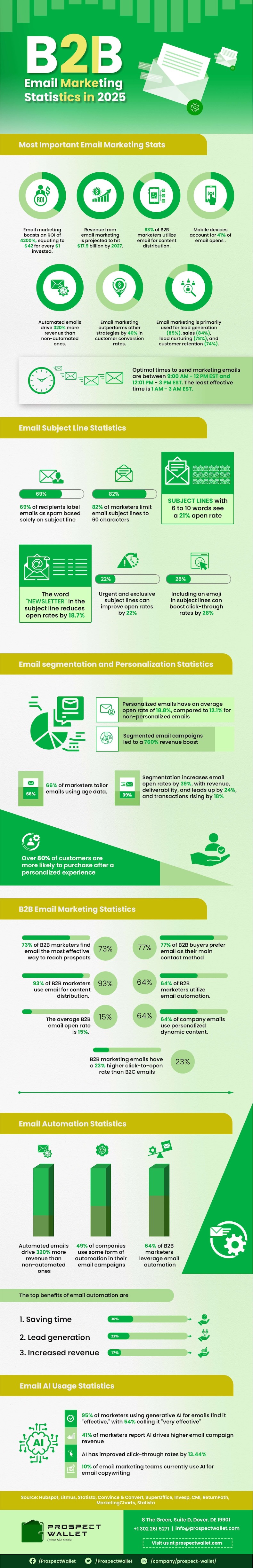 It covers general B2B email insights as well as insights specifically related to email subject lines, email segmentation and personalization, email automation, and AI use in email marketing.