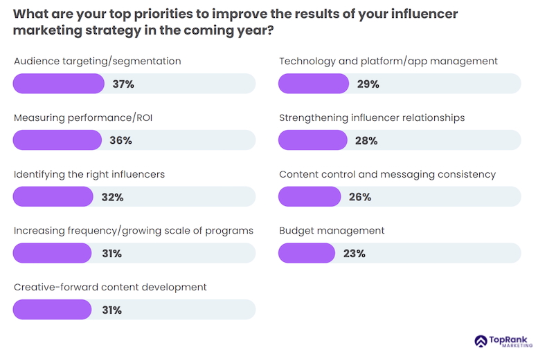 Respondents say their top priorities to improve the results of their influencer marketing strategies are audience targeting/segmentation, performance measurement, and identifying the right influencers.