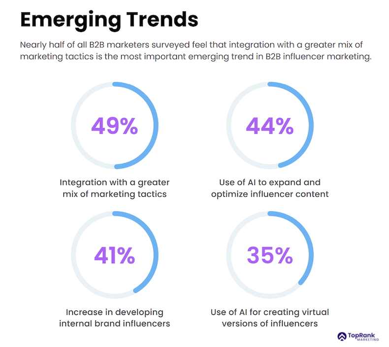 Respondents say the most important B2B influencer marketing trends to watch are the integration of influencer strategies with a greater mix of marketing tactics and the use of AI to expand and optimize influencer content.