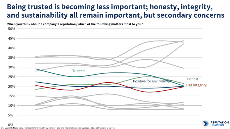 The researchers found that providing good value, having high-quality offerings, and treating employees well were more important to respondents in the most recent edition of the survey compared with earlier editions.