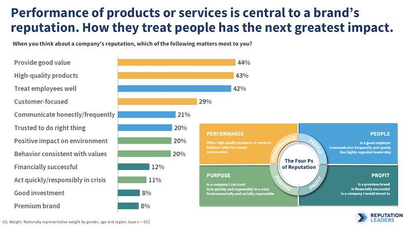 Respondents say the top things that matter to them when considering a brand's reputation are that it provide good value, have high-quality products/services, and treat its employees well.