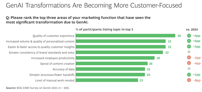 CMOs say generative AI has so far had the most impact on the quality of the customer experience, the volume of personalized content, and the ease of access to customer insights.
