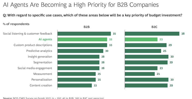 Some 33% of B2B CMOs say AI agents are a key priority for investment, compared with only 23% of B2C CMOs.