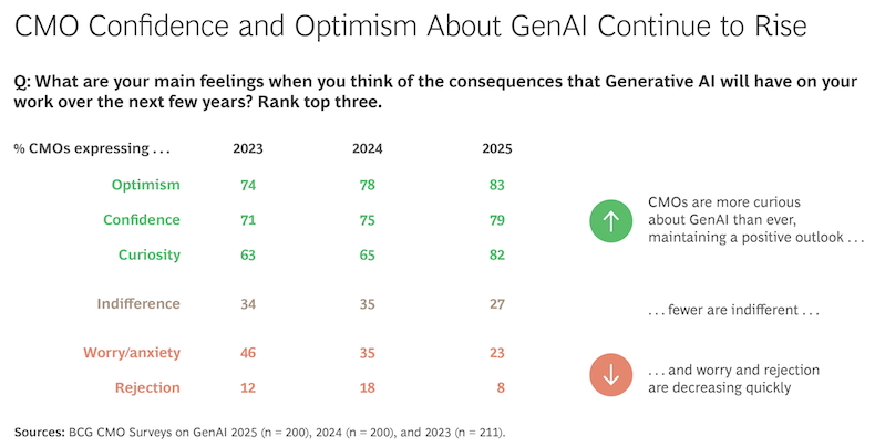 Chief marketing officers are increasingly optimistic, confident, and curious about generative AI, according to recent research from BCG.