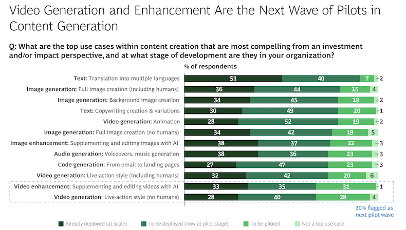 The top content use cases that respondents say they plan to pilot investment in are video enhancement and video generation.