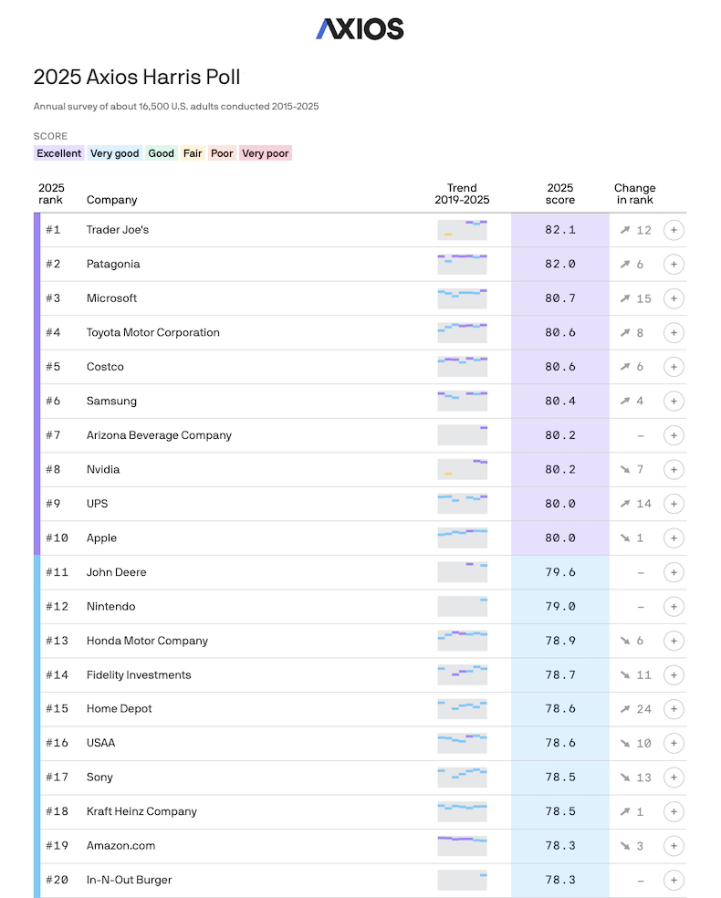 That's according to the 2025 Axios Harris Poll 100 reputation rankings, which was based on data from multiple surveys of adults in the US.