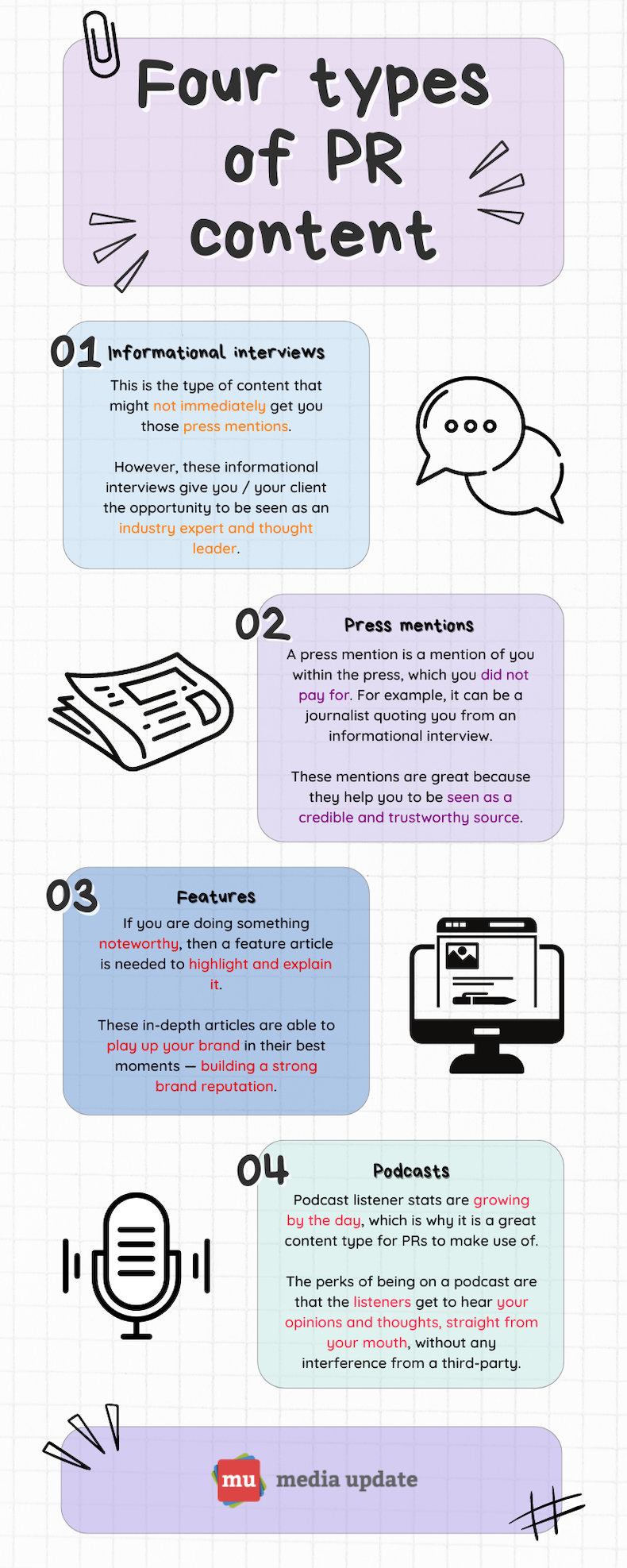 Specifically, it covers four key content types: informational interviews, press mentions, feature articles, and podcasts.