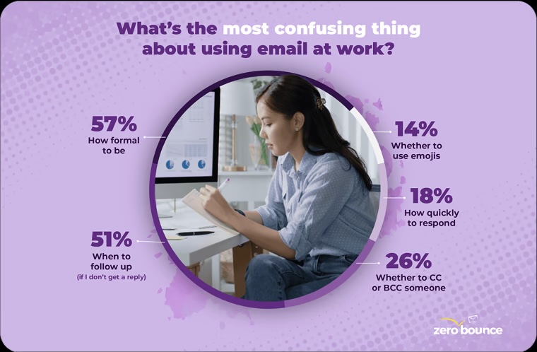 Gen Z workers say the most confusing things about using email at work are figuring out how formal to be (57% cite it as an issue) and when to follow up (51%).