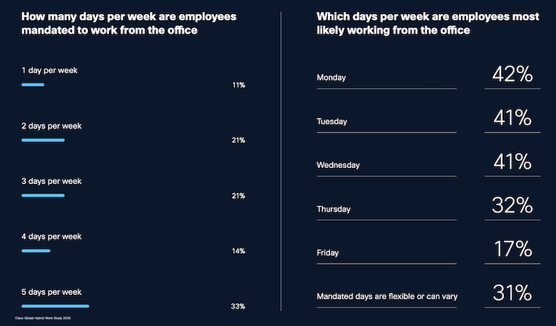 Employees say they're most likely to work from the office on Mondays, Tuesdays, and Wednesdays.