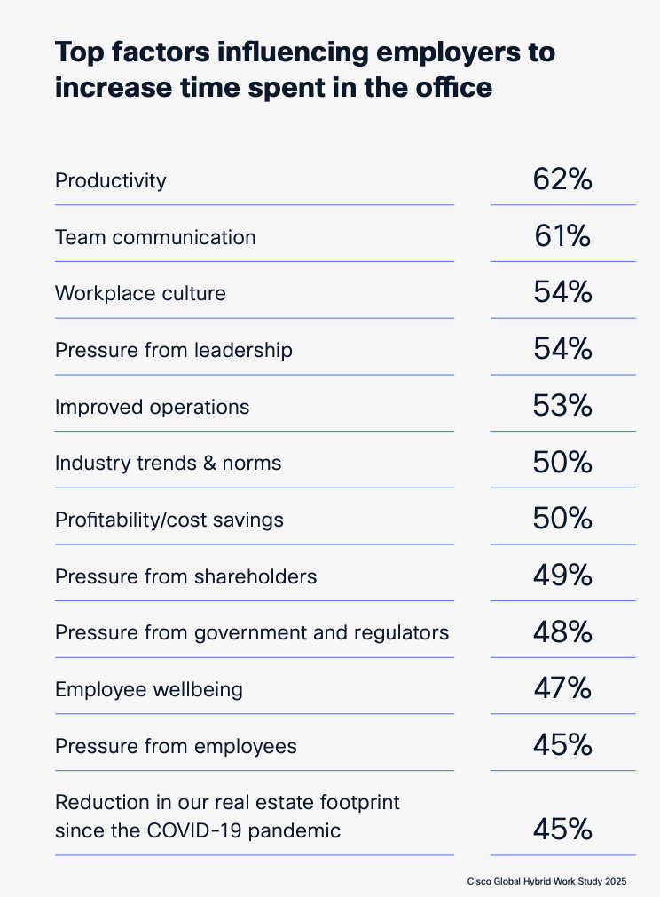 Increased productivity and improved communication are the top factors employers cite as having influenced their decision to increase the amount of time workers must spend in the office.