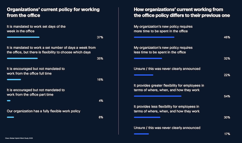 Some 46% of respondents say their organization has changed its policy to require more time to be spent in the office.
