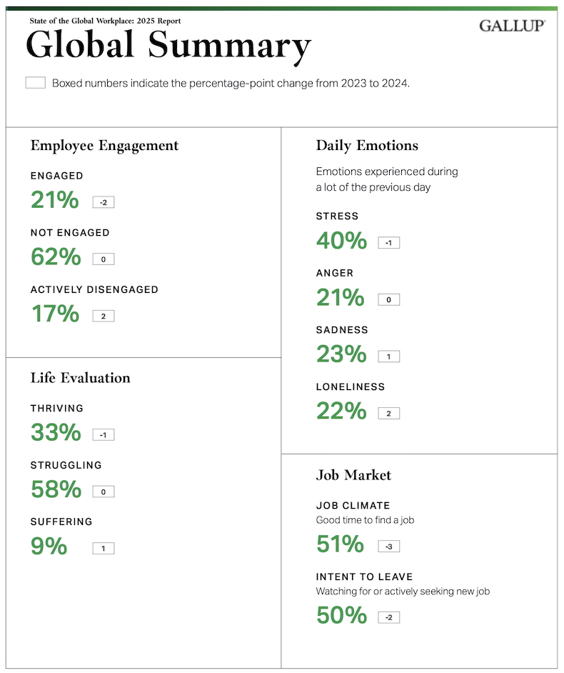 Some 65% of workers say they are not engaged at their job, and 61% say they are struggling with their life outside of the workplace.