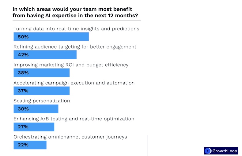 Marketers say the top area where their team would most benefit from having AI expertise in the next 12 months is turning data into real-time insights and predictions.