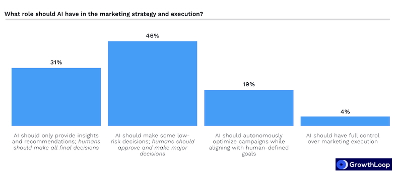 Some 46% of marketers say AI should be allowed to make some low-risk decisions but that humans should approve these choices and make major decisions.