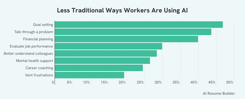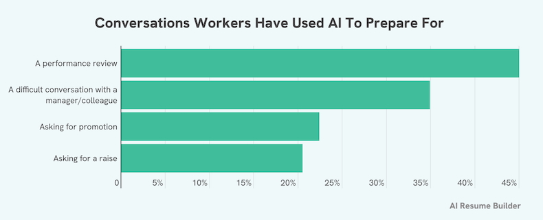 Among respondents who use AI at work, some 45% say they've used AI to prepare for a performance review and 35% say they've used it to prepare for a tough conversation with a manager or colleague.