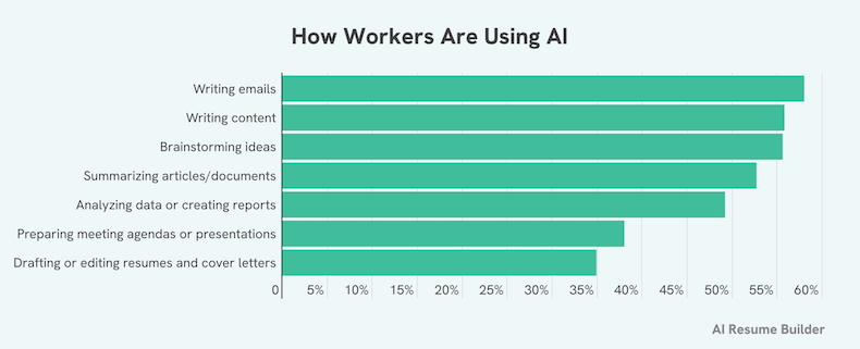 More than half of respondents who use AI at work say they turn to these tools for more traditional tasks, such as writing emails, writing content, brainstorming ideas, and summarizing articles/documents.