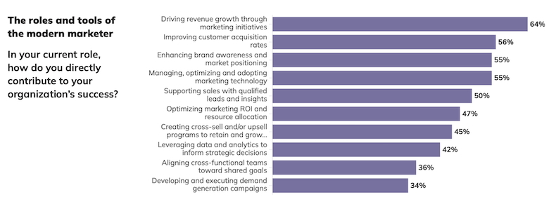 Senior B2B marketers say they are contributing to their organization's success by driving revenue growth through marketing initiatives (64% say so), improving customer acquisition rates (56%), enhancing brand awareness and marketing positioning (55%), and overseeing marketing technology (55%).