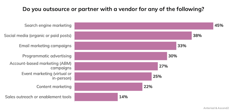 Respondents say their firms partner with outside vendors to tackle a range of tasks, including search engine marketing (45%), social media marketing (38%), and email marketing (33%).