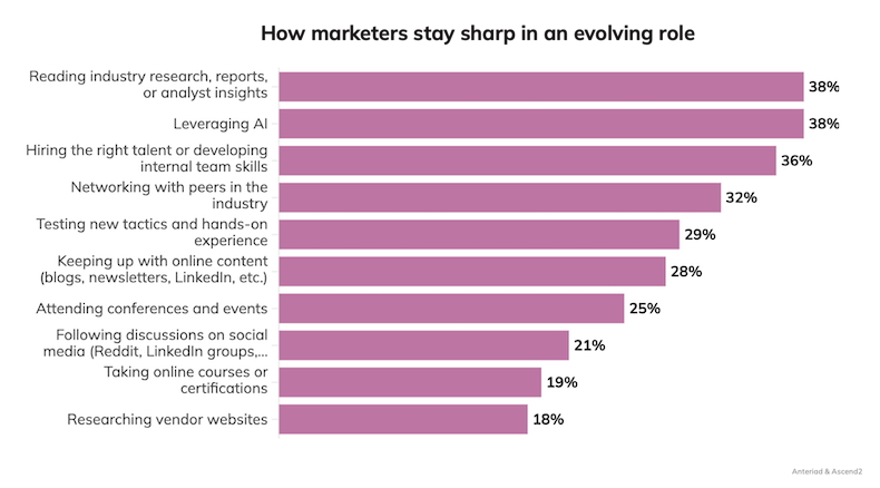 To stay on top of their evolving roles, respondents are reading industry research (38% say they do so), leveraging AI (38%), hiring the right talent or developing internal team skills (36%), and networking with industry peers (32%).