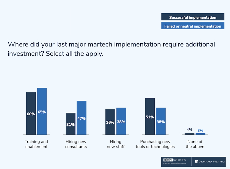 Among respondents whose last martech implementation either failed or delivered neutral results, the top areas that required additional investment post-implementation were training & enablement and hiring new consultants.