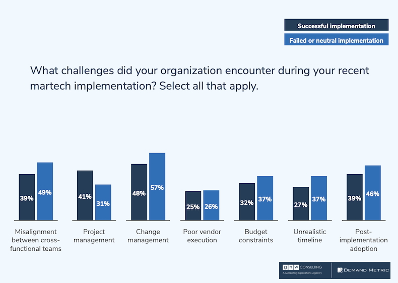 Among that group of respondents, the top challenges faced during their most recent martech implementation were change management, misalignment among cross-functional teams, and post-implementation adoption.