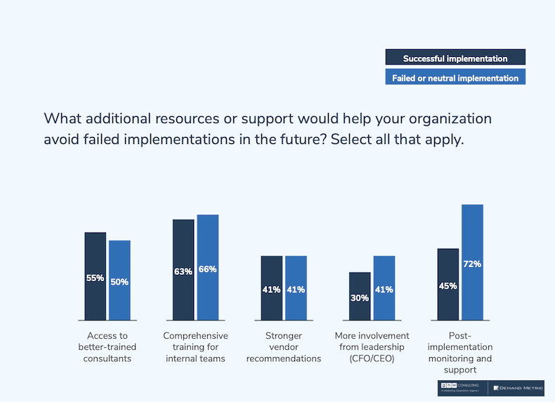 Respondents whose last martech implementation either failed or delivered neutral results say the top things that would help them avoid future failures are additional post-implementation support, comprehensive training for internal teams, and access to better-trained consultants.