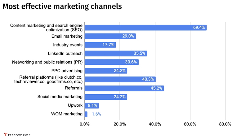 Respondents say the most effective marketing channels for their IT services business are content marketing/SEO, referrals, and LinkedIn outreach.