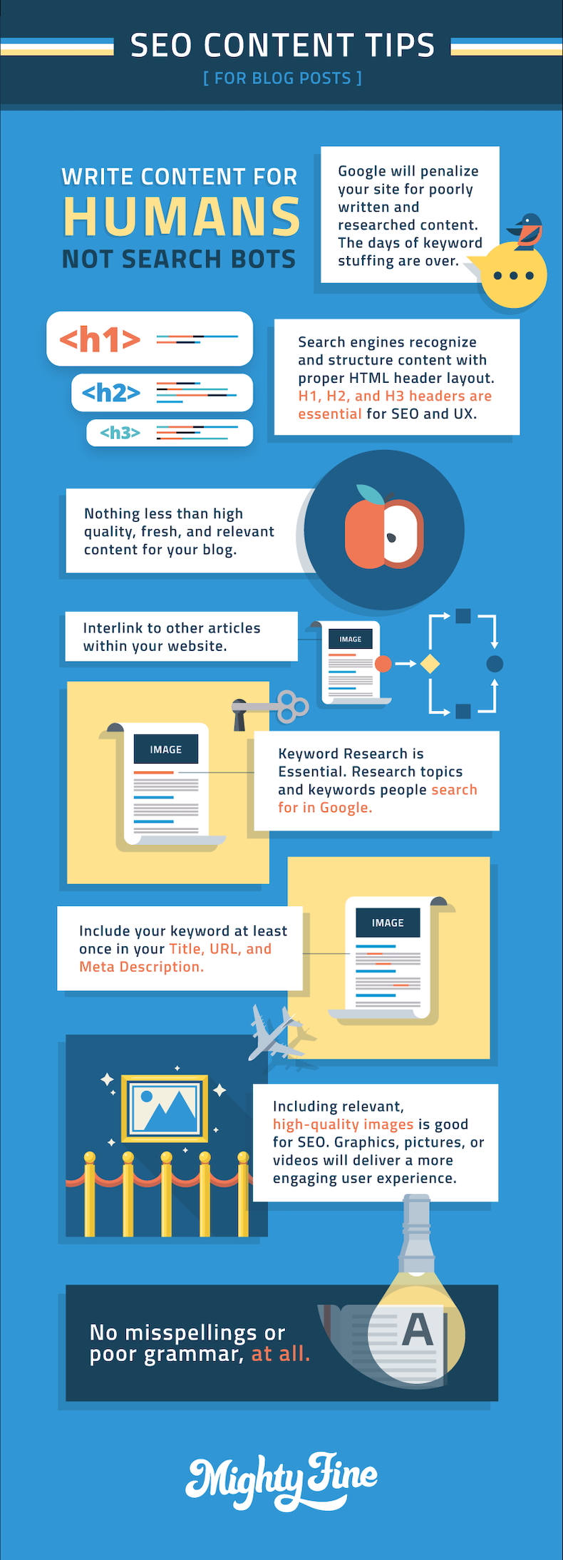 An infographic (below) from Mighty Fine covers the essentials of SEO for blog posts.