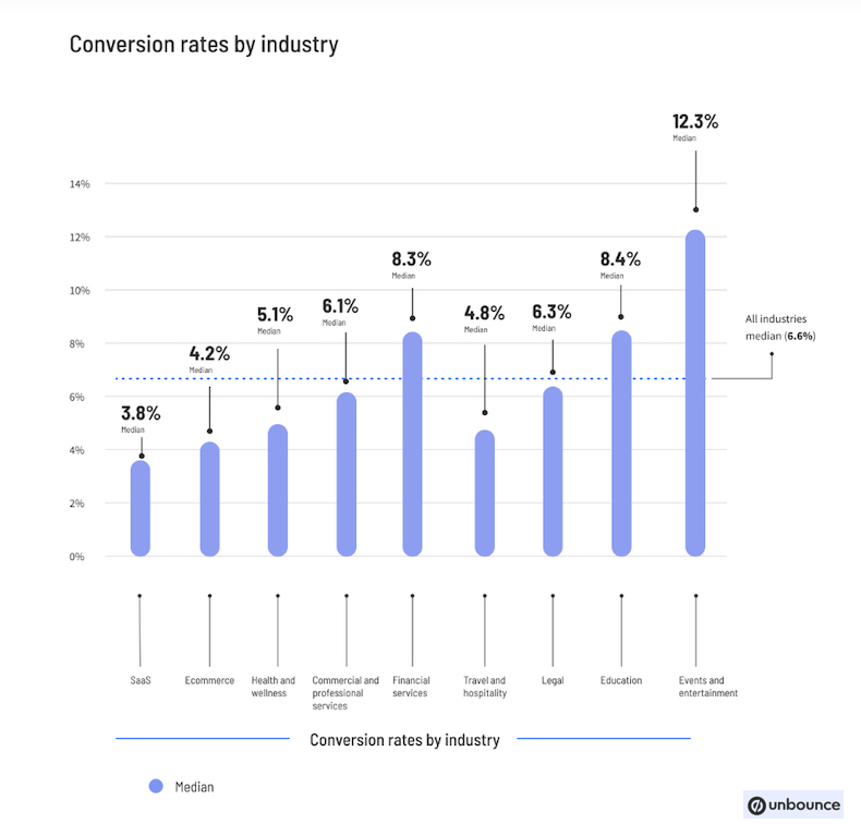 They also found that the median conversion rate varies significantly among industries. For example, website landing pages for financial services companies have a median conversion rate of 8.4%, whereas website landing pages for SaaS companies have a median conversion rate of 3.8%.