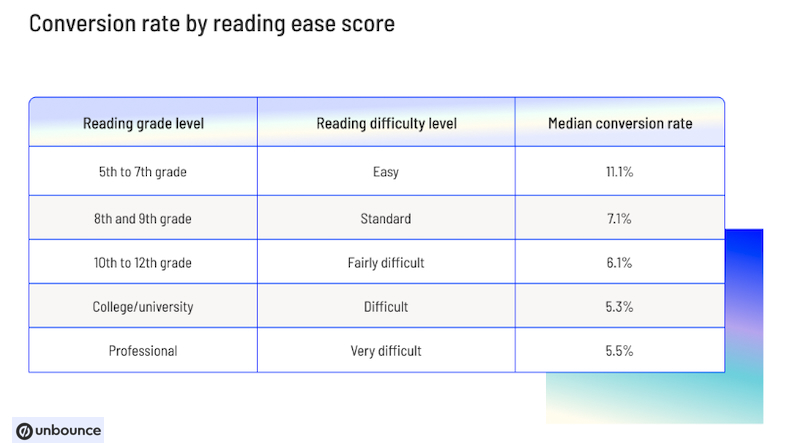 Lower reading difficulty is correlated with more conversions, the study found. For example, website landing pages with copy at a fifth-to-seventh grade reading level have an 11.1% median conversion rate, whereas website landing pages with copy at a college reading level have a 5.3% median conversion rate.