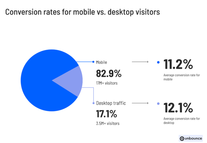 Most visitors (82.9%) access website landing pages via a mobile device; however, visitors using a desktop computer have a higher average conversion rate (12.1% vs. 11.2%), according to the research.
