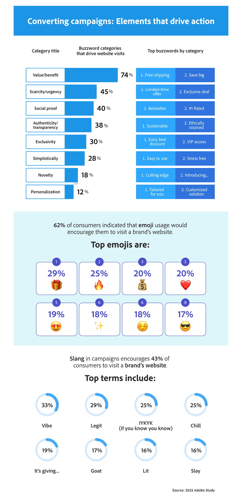 It also explores the top emojis and slang that people say would encourage them to visit a brand's website.