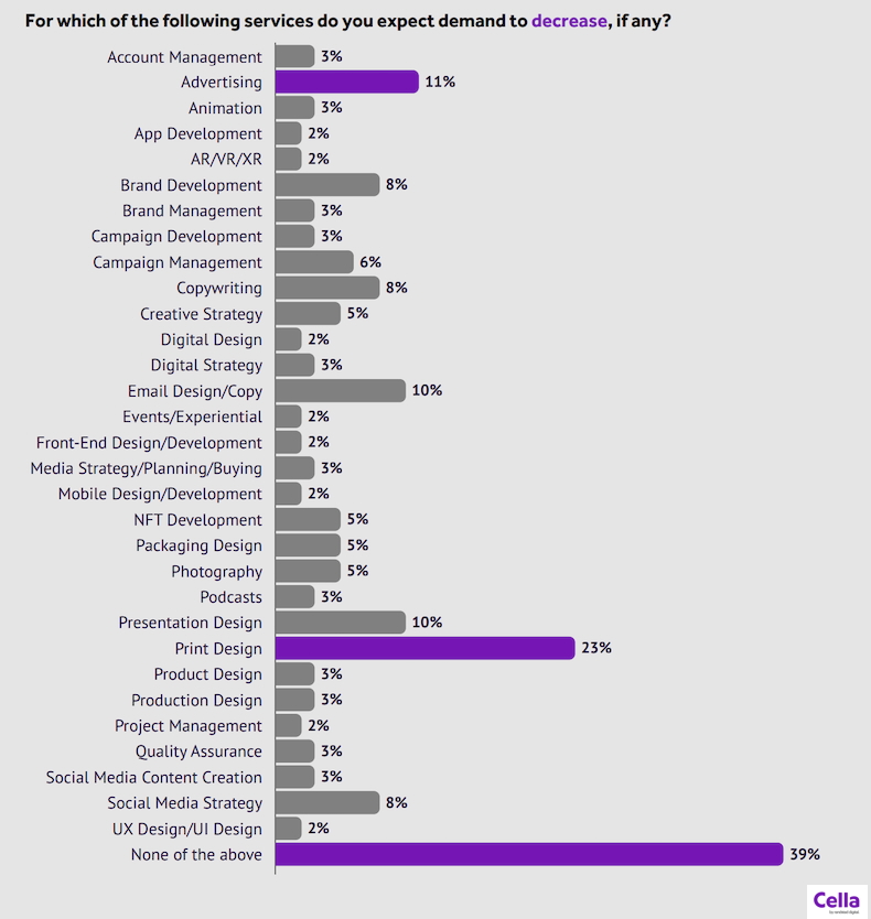 Creative professionals say the services most likely to decrease in demand are print design (23% expect a decrease) and advertising (11%).