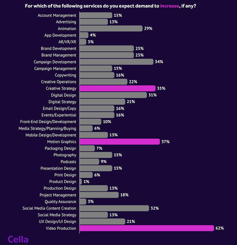 Some 62% of respondents say they expect demand to increase for video production, 37% expect demand to increase for motion graphics, and 35% expect demand to increase for creative strategy.