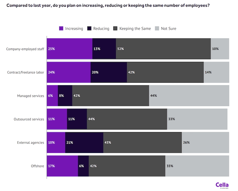 Only one-fourth of respondents expect to increase the size of their company-employed creative staff this year, and just 24% expect to increase the number of contract/freelance creative workers.