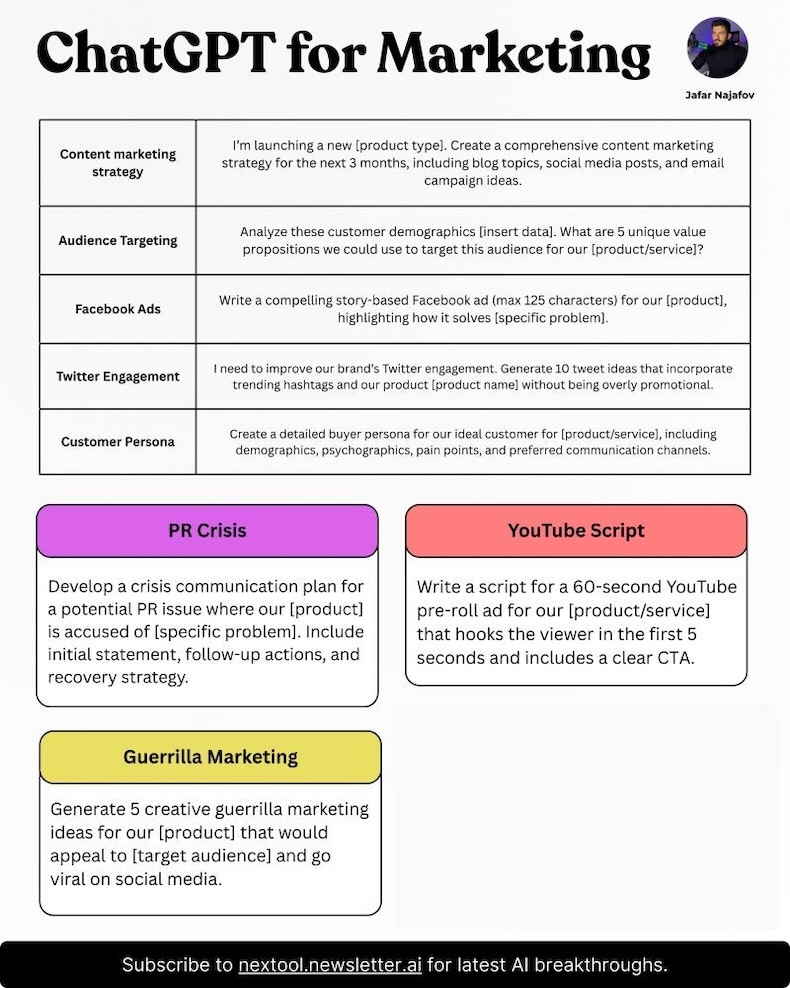 It covers ChatGPT prompts that you can use to generate basic content for eight needs: content marketing strategy, audience targeting, Facebook ads, Twitter/X engagement, customer personas, PR crisis management, YouTube scripting, and guerilla marketing.