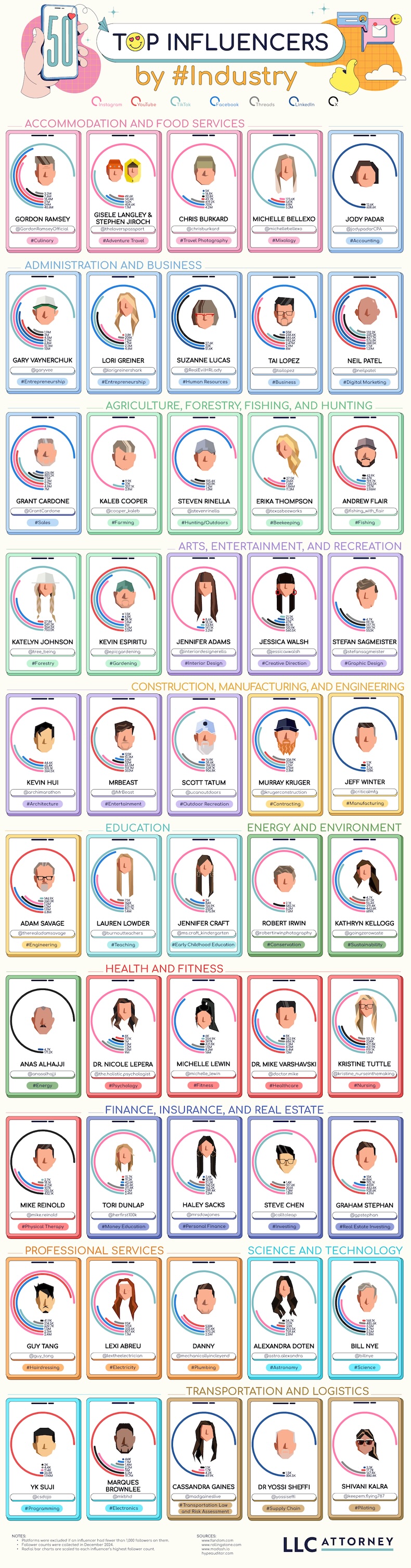 It shows the 50 top influencers by industry, with each one's main handle and their follower counts on various platforms.