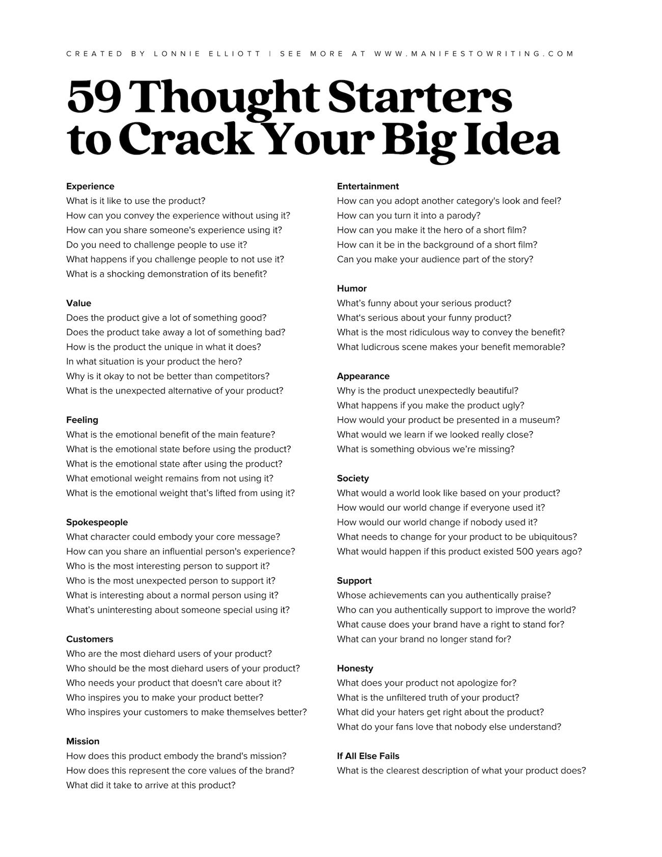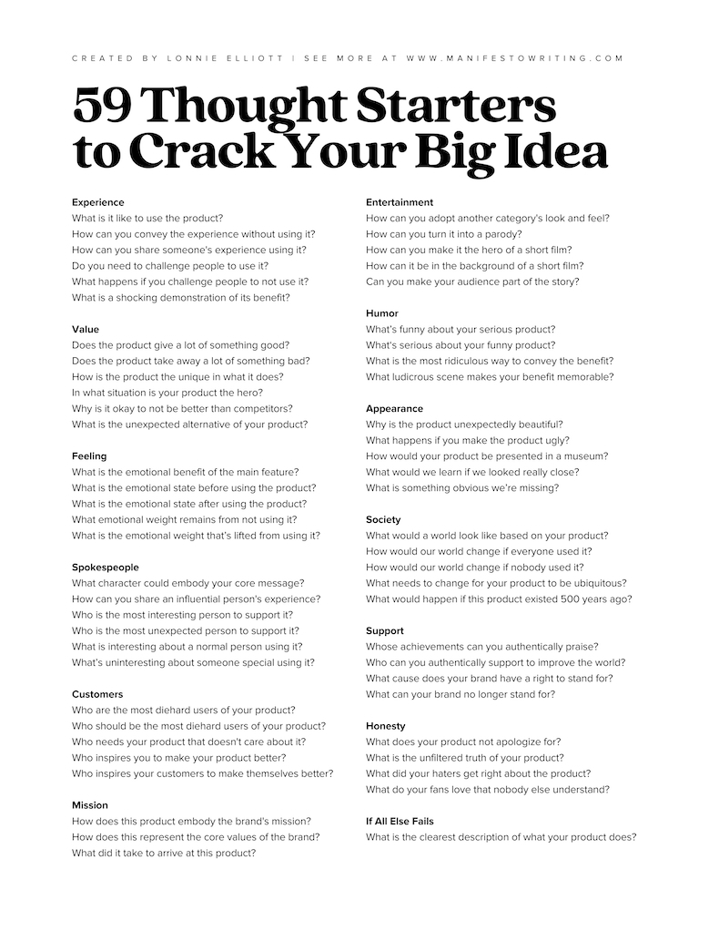 To help, Manifesto Writing created an infographic (below) covering 59 thought starters to help you crack the Big Idea.