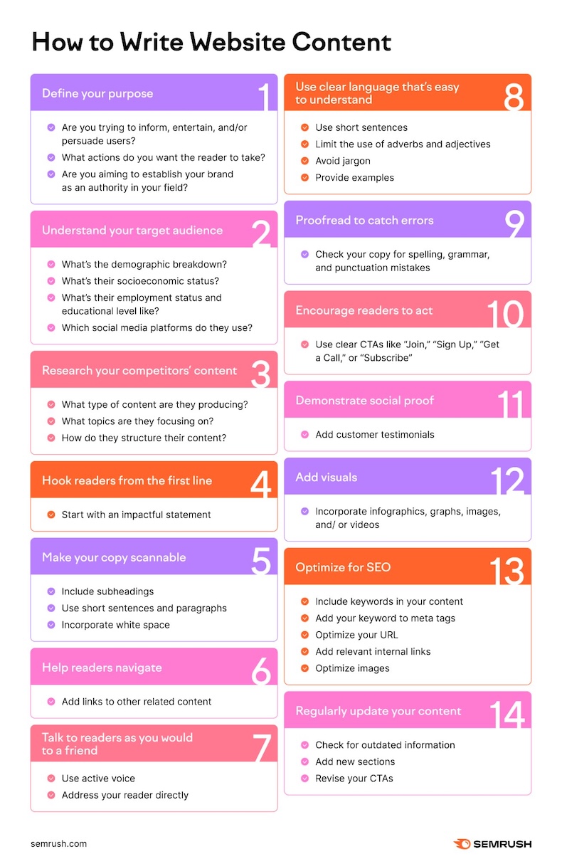 An infographic (below) from Semrush delves into how to develop content that helps you accomplish your goals.