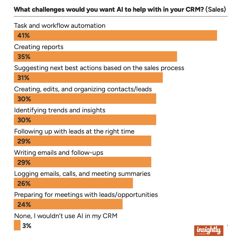 Respondents say the top challenges they would want AI to help with in their CRM are task and workflow automation, creating reports, and suggesting next best actions based on the sales process.