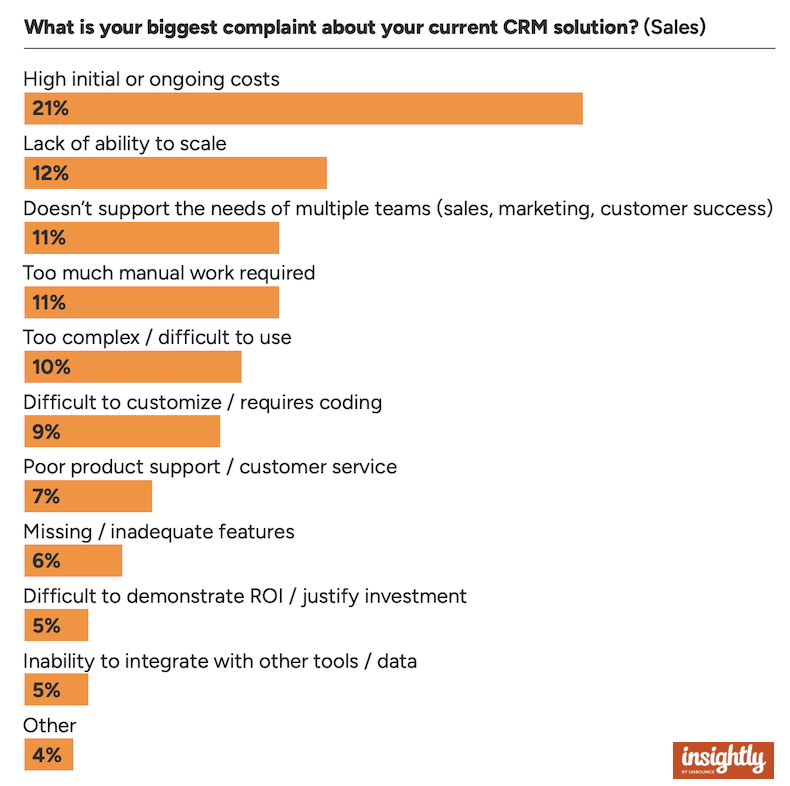 B2B salespeople say their biggest complaints with their current CRM solution are high costs, a lack of ability to scale, and the inability to support multiple teams.