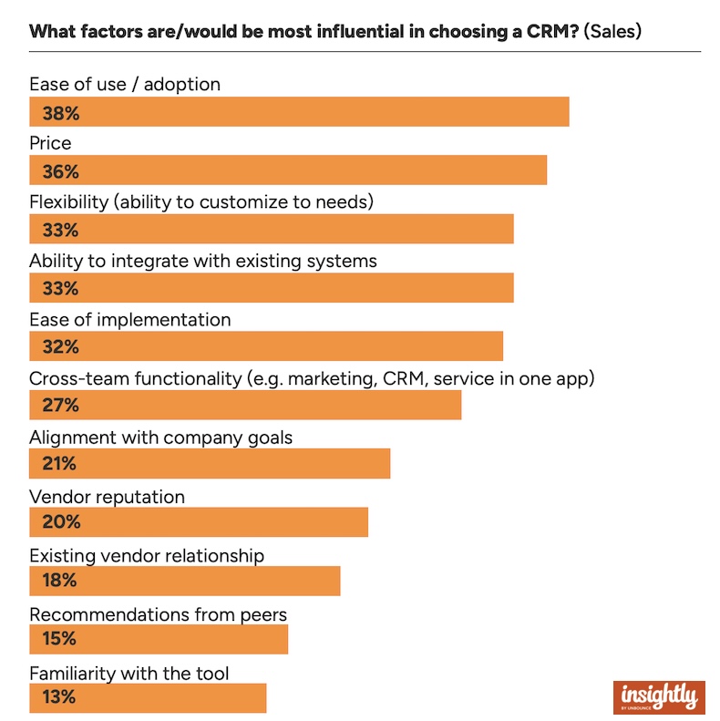 Respondents say the factors that are most influential when choosing a CRM are ease of use/adoption, price, and flexibility (ability to customize).
