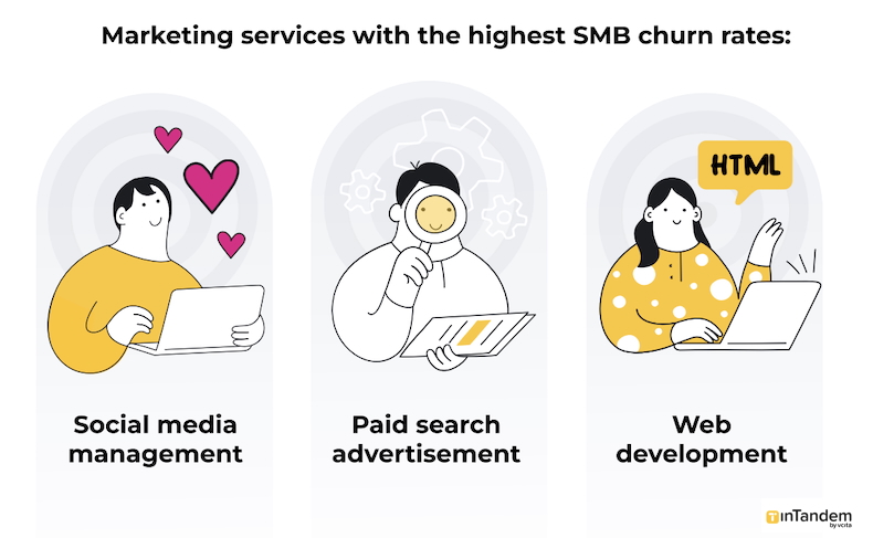 The marketing services with the highest SMB churn rates are social media management, paid search advertising, and Web development.