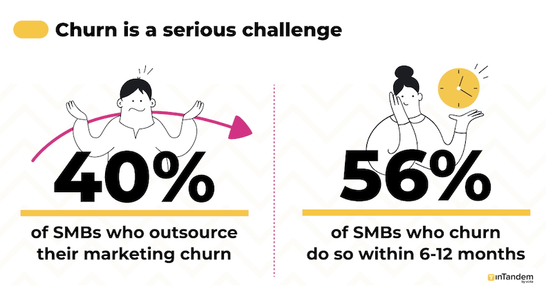 Some 40% of the SMBs that outsource their marketing to an agency churn, and more than half (56%) of those that churn do so within 6-12 months.
